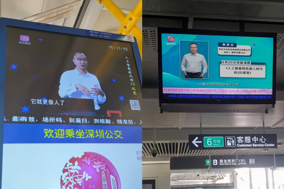近日,以奧比中光創(chuàng)始人、董事長兼CEO黃源浩博士為嘉賓的深圳市民文化大講堂節(jié)目播出,亮相深圳500塊室內(nèi)外樓宇大屏以及地鐵、公交全線,為深圳市民帶來一場3D視覺感知技術(shù)與應(yīng)用的全面科普。