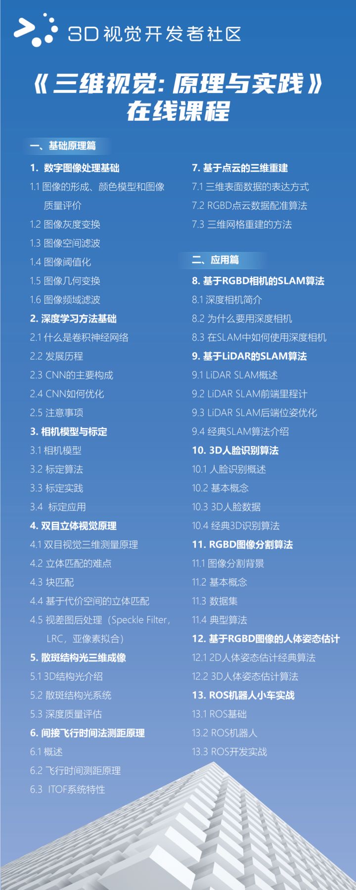 該課程由奧比中光多位算法專家、資深算法工程師打造,系統(tǒng)地介紹了3D視覺的基本原理及應(yīng)用實(shí)踐。課程內(nèi)容涵蓋基礎(chǔ)二維圖像處理算法、深度學(xué)習(xí)方法、相機(jī)模型與標(biāo)定、雙目立體視覺、散斑結(jié)構(gòu)光、飛行時(shí)間法(ToF)等三維成像原理與算法、基于點(diǎn)云的三維重建算法、基于RGBD相機(jī)和LiDAR的SLAM算法、3D人臉識別算法、RGBD圖像分割算法、基于RGBD圖像人體姿態(tài)估計(jì)、ROS機(jī)器人小車實(shí)戰(zhàn)等,幫助學(xué)生、開發(fā)者在3D視覺領(lǐng)域?qū)崿F(xiàn)從入門到精通的進(jìn)階。