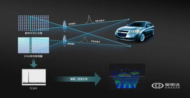奧銳達(dá)的激光雷達(dá)采用創(chuàng)新性的VCSEL+SPAD技術(shù)方案。其中,多節(jié)可尋址VCSEL(Addressable VCSEL)通過可控的多光束掃描技術(shù),對外發(fā)射VCSEL激光器的點陣多光束光源;同時,探測器可以開啟與發(fā)射相對應(yīng)的區(qū)域,接收目標(biāo)反射光;最終通過電子掃描,完成整個視場范圍內(nèi)的激光雷達(dá)點云獲取。